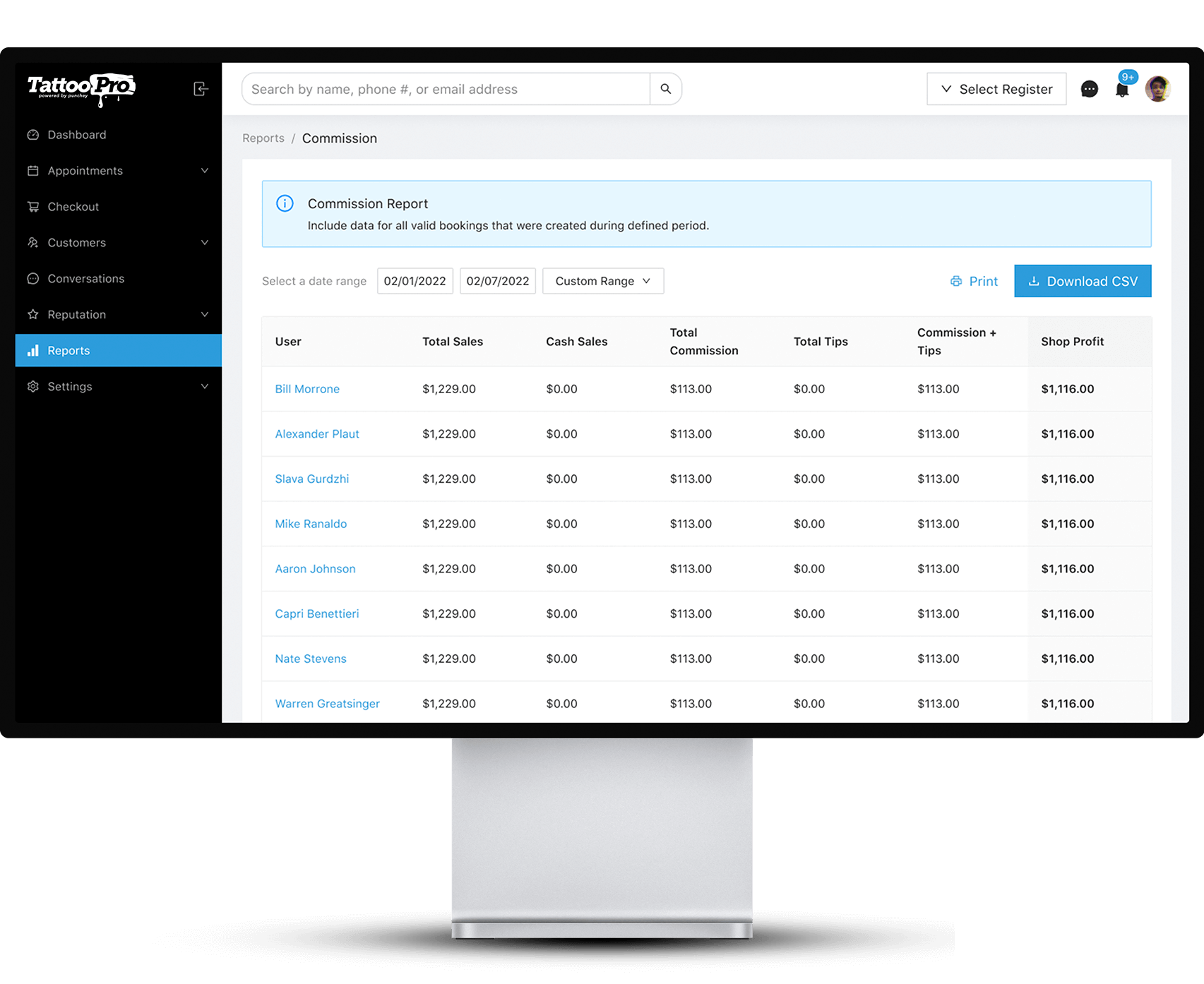 Are you tired of manually tracking commissions for your tattoo artists and piercers? Look no further than TattooPro commission reporting! This easy-to-use platform automatically calculates and tracks commissions based on the percentages you set, so you can save time and hassle. Simply checkout using the TattooPro point of sale or mobile app and let the system do the rest. Whether you have one artist or a whole team, TattooPro commission reporting is the simplest way to stay on top of commissions. Try it today!