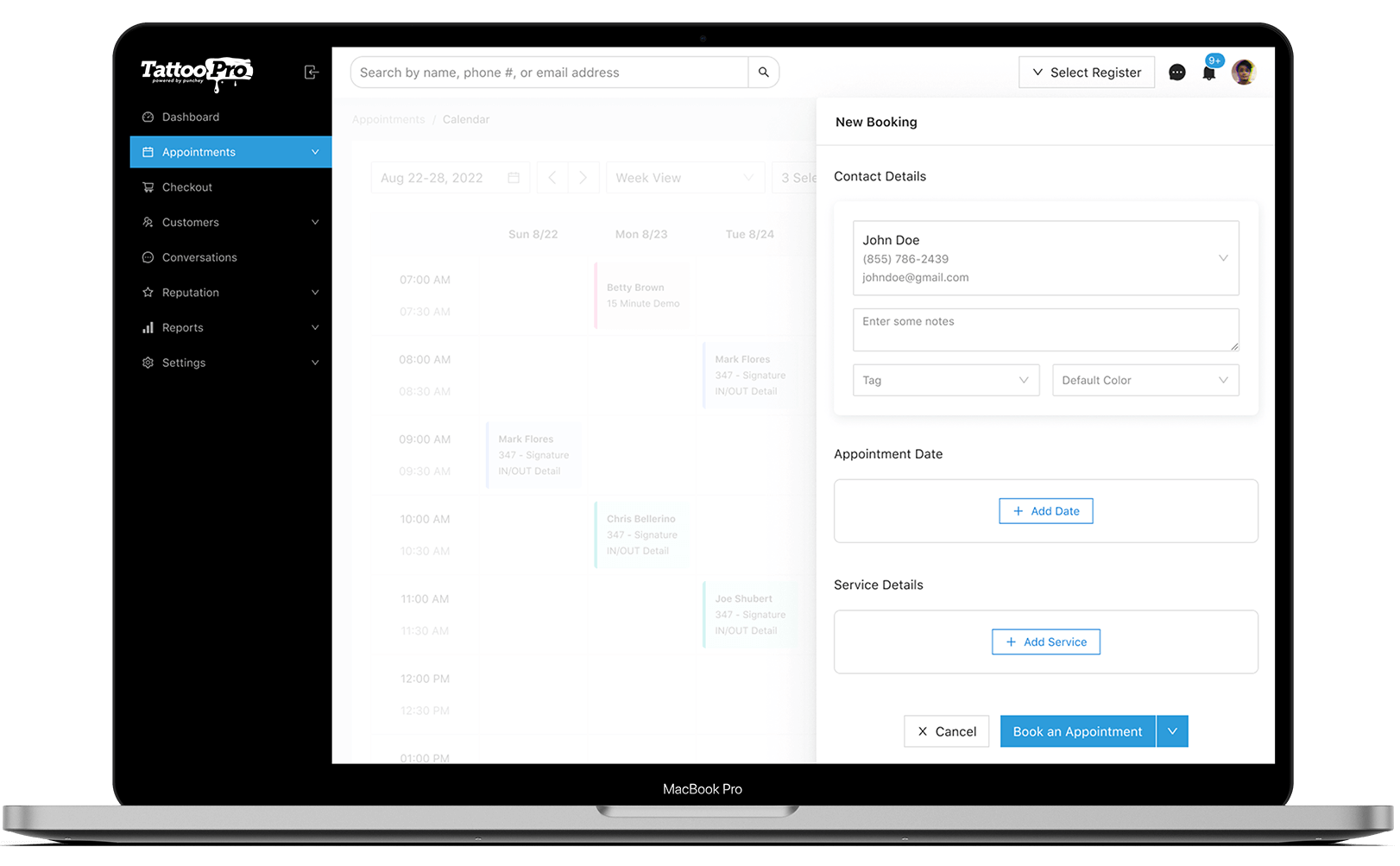 TattooPro software comes with the industry's leading online booking app. Add a direct booking link to your website or Instagram page and you can schedule appointments while you're sleeping!